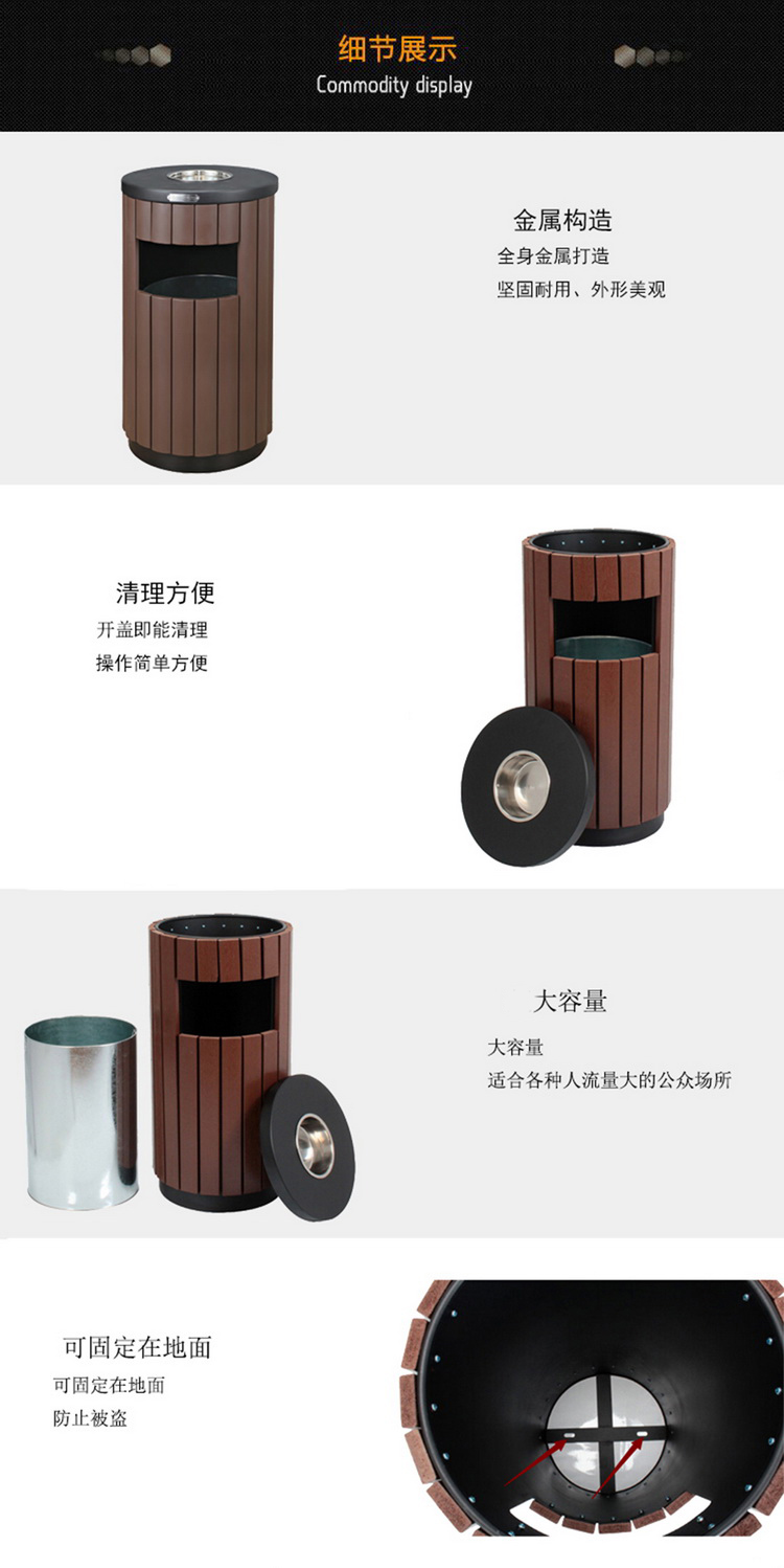 此款垃圾桶新款上市,做工精美,款式新穎,外觀自然簡樸,采用特別的防銹處理,戶外漆噴涂,防腐、防日光照射,經(jīng)久耐用,做工精美,質(zhì)量有保證。整體圓型設計,頂部配備煙灰缸,側面投口更方便,配備優(yōu)良加厚內(nèi)桶。適用于:各銀行、車站、學校、醫(yī)院、郵局、劇院、空港、機場、地鐵、商場超市,展覽展示中心、酒店、俱樂部、會所、商務樓宇等。